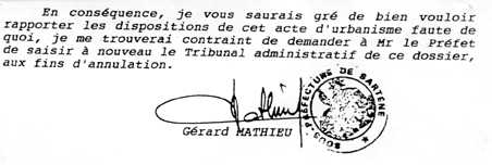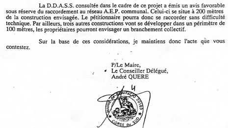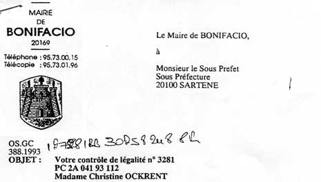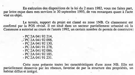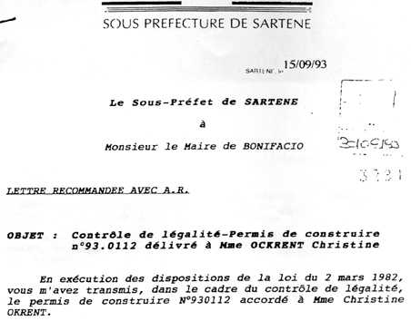 Quand la ficelle est un peu grosse pour les services de l'état Il arrive que par accident les services de l'état en Corse appliquent le droit commun, et le Sous Préfet de Sartè a tenté candidement de rappeler quelques règles en matière d'urbanisme à un élu du "Triangle des bermudes" (Bunifaziu / Porti-Vechju / Pruprià) :
